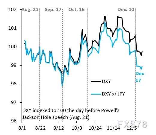 上图揭示了问题的核心。黑线代表美元指数,衡量的是美元兑十国集团货币的贸易加权值。蓝线则是剔除日元后的美元指数。
