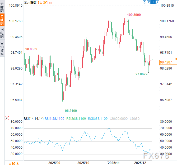美元指数表面稳定,实则存在结构性疲软,其相对强势主要由日元极端贬值所支撑。市场资金正从美元体系流向贵金属及其他避险资产,形成“货币贬值交易”浪潮。周五(12月19日)亚市早盘时段,美元指数于98.45附近震荡。